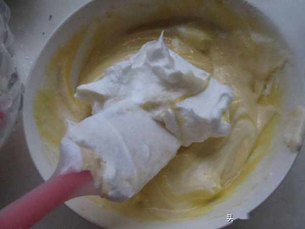 4,把蛋白霜加到蛋黃糊中翻拌均勻。