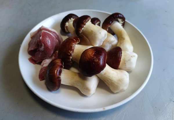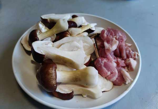 1.姬松茸用小刀刮去殘留在上面的污漬,清洗幹凈備用,去皮五花肉洗凈後切成薄片。