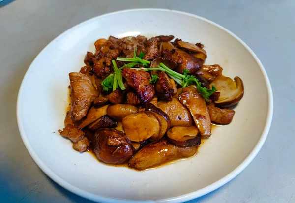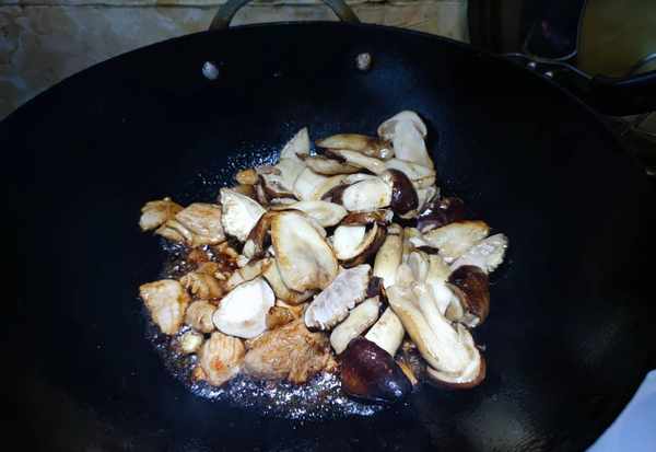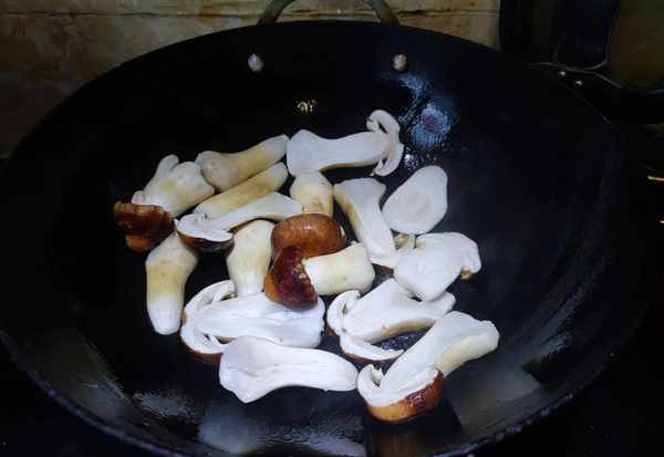 5.鍋中下入煎好的姬松茸跟肉片一起翻炒均勻,加入鹽和蠔油調味,滴幾滴花椒油即可出鍋享用。