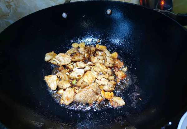 4.鍋中重新入油下入醃制好的五花肉片,翻炒至肉片變色後,加入蔥薑蒜爆出香味,烹入料酒和一品鮮醬油把肉片炒上色,加入少許花椒面炒香。
