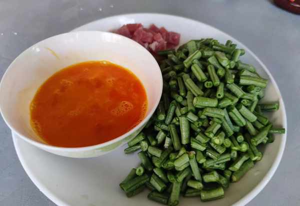 1.豇豆摘洗幹凈瀝幹水分備用,裡脊肉剔去白色筋膜後切成小丁。
