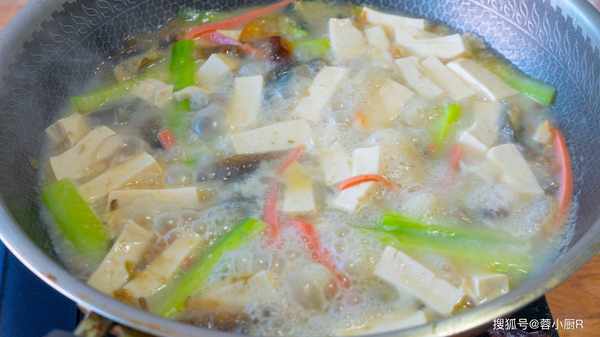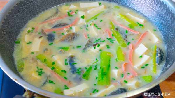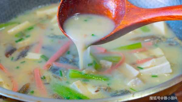 8、湯色就開始發白瞭這時候倒入黃瓜、火腿、豆腐,蓋上繼續煮5分鐘。
