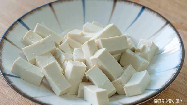 3、豆腐一塊兒,切成小丁備用。