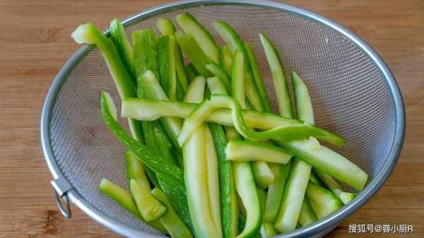 2、西葫蘆切粗一點的條,裝入大碗裡後加少許鹽醃制一下,這樣炒的時候西葫蘆會出水少。