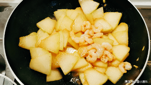 3、蝦仁變色後,加入一勺食鹽、1勺生抽、1勺蠔油,炒均勻後再將冬瓜放進去翻炒均勻,加2碗清水蓋上鍋蓋煮開;