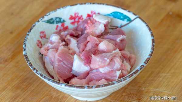 1、豬肉切調小丁,裝入碗裡後加料酒去腥,再加一小勺淀粉,攪拌均勻再來一勺食用油,接著醃制10分鐘。