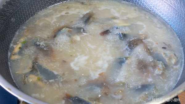 6、起鍋熱油,下蔥蒜爆香,倒入皮蛋,煎到有點焦焦後倒入一大碗開水。