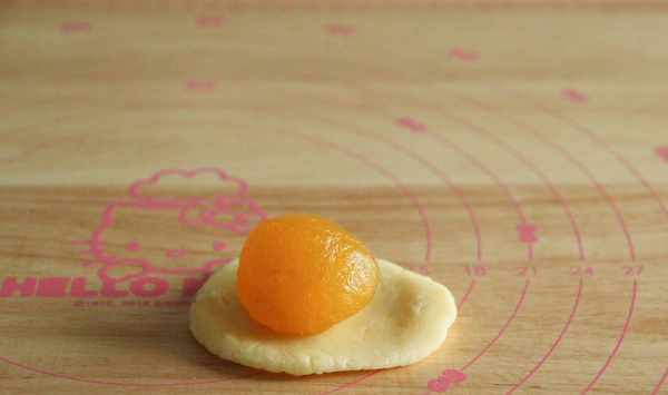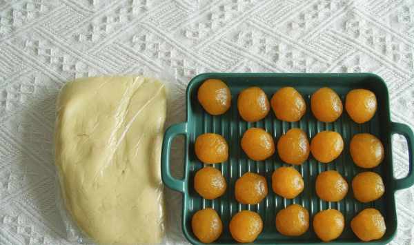 8、花型取18克皮,鳳梨形取15克皮。餅皮搓圓放在手心,用另一手按壓成圓形,放入餡料球。