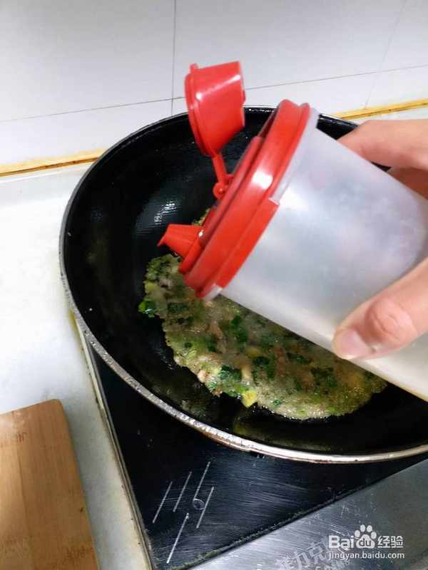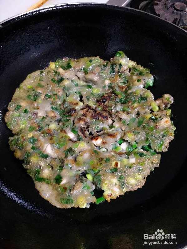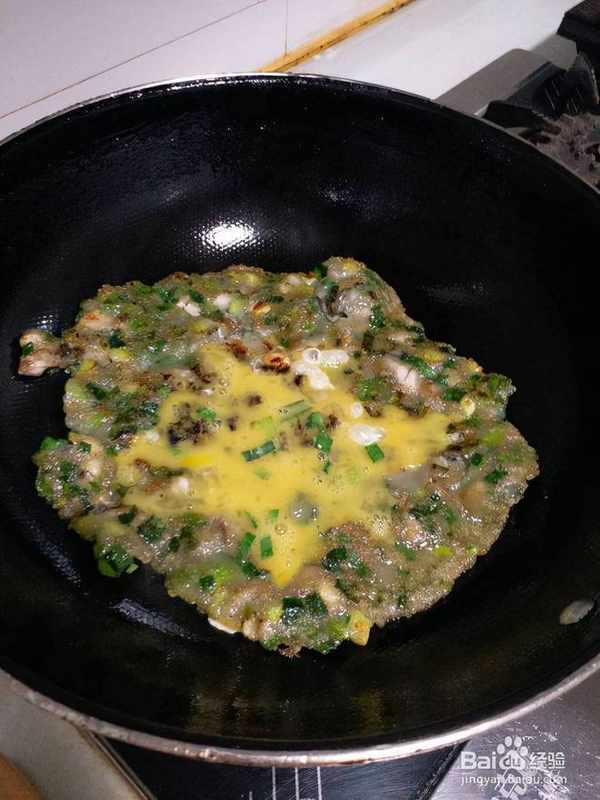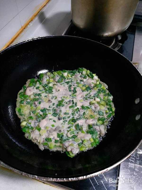 9倒入牡蠣面糊,用筷子或抹刀移動面糊,盡量擴大面積,減少厚度。