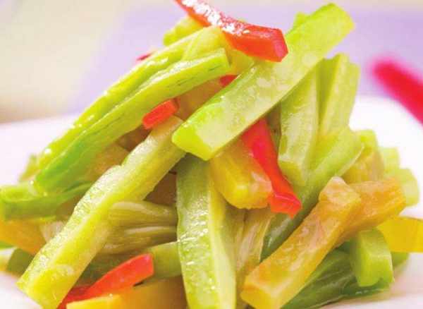 材料:苦瓜250克,泡酸菜50克,甜椒30克,精鹽1/2小匙,味精1/3小匙,香油、植物油各2小匙。