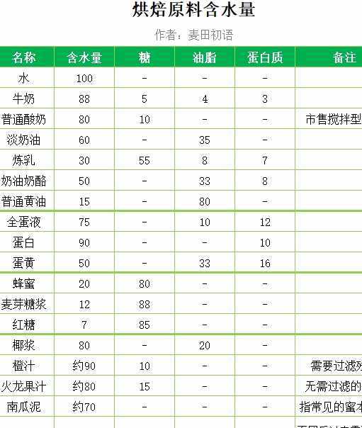 在加入液體資料時,你不僅僅要考慮資料的水分,還要知道它們會帶入哪些物質,對麵包有什麼影響,比如提高麵團的含糖量、新增風味、延緩麵包老化等。囙此,在計算這些資料水量的同時,也要考慮它們帶入的油、糖、酸、色素等成分。下麵我將對製作麵包常用的濕性資料進行分類說明,在此之前,你可以先參攷一下這張食材匯總表。