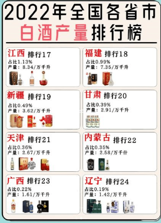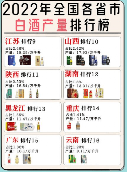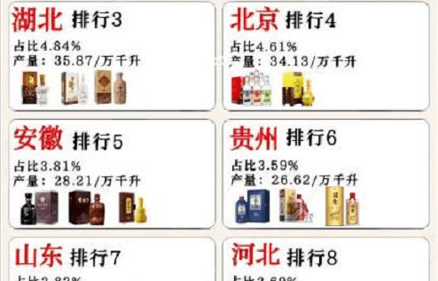 在全國白酒產量中,山東、湖北、安徽及江蘇的貢獻也是功不可沒,尤其是湖北白酒的產量,看似當地沒有什麼名酒,而且過去的名酒黃鶴樓也名不副實,但是這幾年白雲邊等湖北白酒異軍突起,憑借實惠的價格和不錯的品質開始暢銷多省,就連南方市場都又不錯的銷量,所以也提升瞭湖北酒的產量。