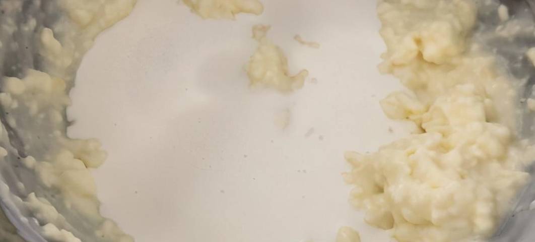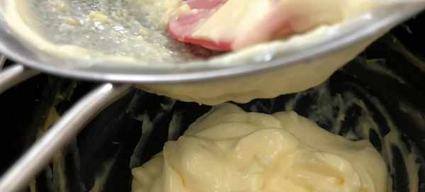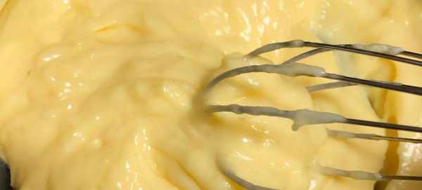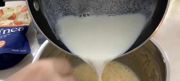 6.純牛奶250g用奶鍋小火加熱,到奶面邊緣有氣泡即關火。把加熱的牛奶分次倒入上面攪拌好的蛋黃醬中,邊倒邊加熱。