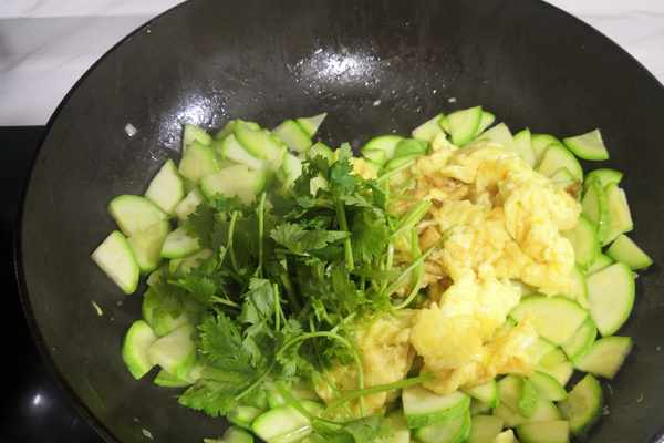 利用攤雞蛋的餘油炒蔥花,倒入西葫蘆大火翻炒斷生,倒入雞蛋、香菜,加點鹽和味極鮮醬油,大火炒勻後,倒入蒜末炒勻出鍋,簡單快手,鹹香可口