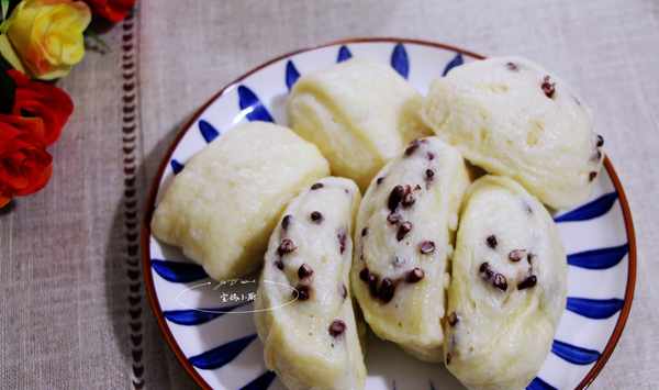 食材是300克麵粉,加乾酵母3克,加水攪成稠稠的、攪著費勁的麵糊,冰柜冷藏慢發酵一夜,早起不揉面,兩手拉抻麵團變長,捲入蜜豆(粘手用乾粉),切段後上鍋後餳8分鐘,大火燒開,上汽後開始計時,12分鐘關火,燜3分鐘出鍋
