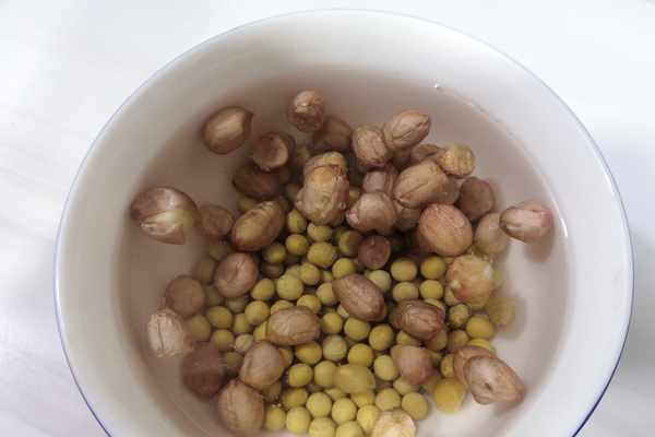 麥片花生豆漿,需要的食材是1大把幹黃豆,1大把生花生,2把麥片,清水1200毫升。黃豆和花生需要睡前洗淨浸泡一夜。這些是四口人的量