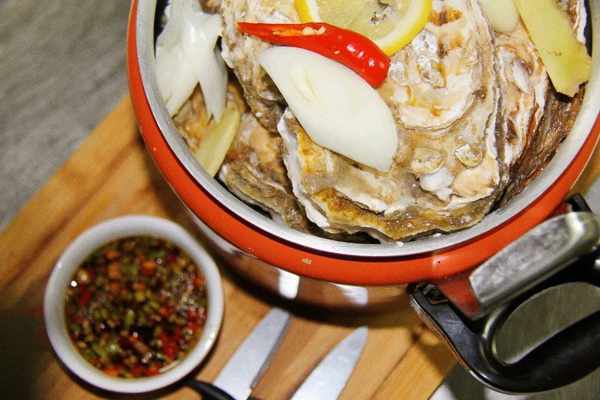 生蠔一定是個頭大,貝肉肥美鮮嫩的,師傅嫻熟地把幹凈的生蠔壓進小鍋,等火候到位開鍋放氣的時候就已經可以問到鍋裡鮮嫩的味道。