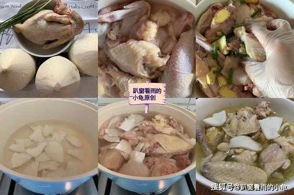 原料:椰子3個,仔雞1隻,料酒、蔥段、薑片適量。