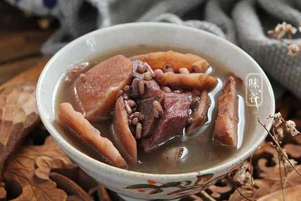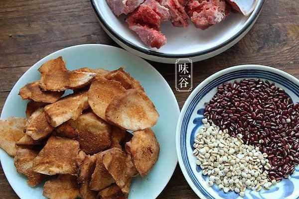 【食材】:土茯苓 100克、豬扇骨 250克、赤小豆 1把、薏米 1把、生薑 2片、鹽 1小勺