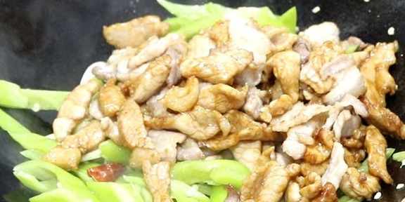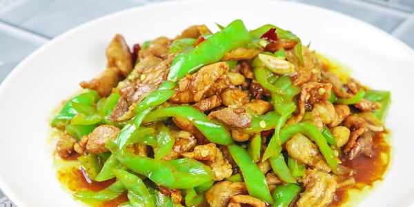 鍋內留少許底油,倒入青椒快速翻炒,加入食鹽1.5克,翻炒化開,放入蒜片和紅幹椒,炒出蒜香味以後,倒入肉片,從鍋邊淋入少許料酒,翻炒兩下,利用鍋氣的蒸發,帶走猪肉的腥味。