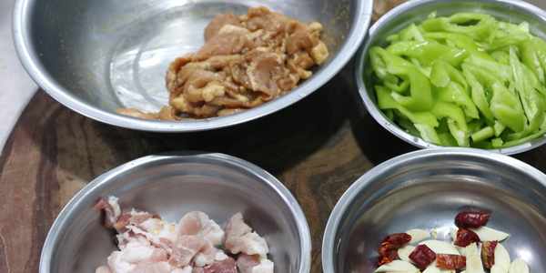食材:青椒,猪五花肉,猪瘦肉,紅幹椒,大蒜