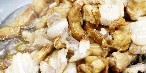 炒鍋燒熱,添入一勺食用油,充分滑鍋後倒出,再添入半勺凉油,這一步是起到熱鍋凉油食材不容易粘鍋的目的。然後倒入五花肉片,簡單翻炒。