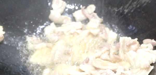 將五花肉,炒出肥油後,倒入醃好的瘦肉,繼續翻炒幾下,炒至肉片斷生以後,倒入盆中備用。