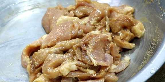 將切片後的猪瘦肉,放入拌菜盆中,加入食鹽1克,胡椒粉0.5克,料酒適量,醬油幾滴調色,水澱粉適量,用手順一個方向攪拌,打上勁,醃制五分鐘備用。