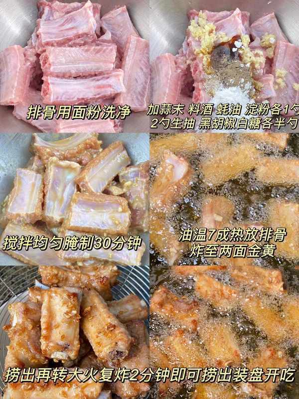 溫馨小貼士:排骨要是肉厚,若是根據以上時間炸得不夠熟,那就需要適當炸長一點時間!(註意別炸老瞭,排骨炸至金黃色或一點點焦黃色)