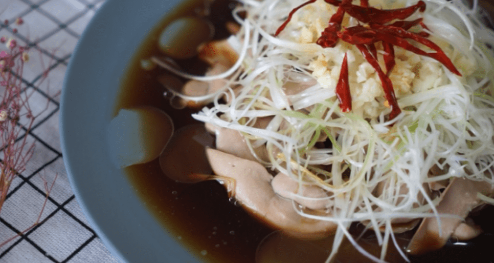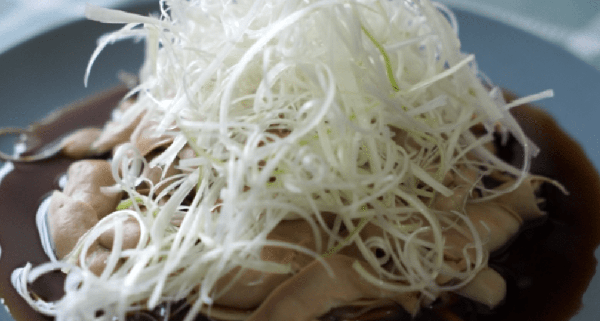 5、 將腰片墊在盤子上面,淋上生抽,放上蔥卷,喜歡吃辣的可以放一些幹辣椒絲;