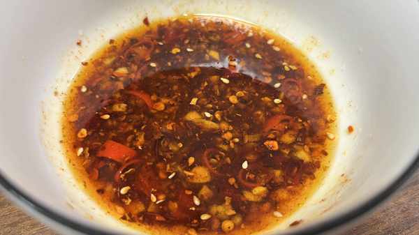 4、 大蒜去皮,剁成碎末,放在一個碗裡面,加入小米辣圈圈、辣椒面,淋上熱油;