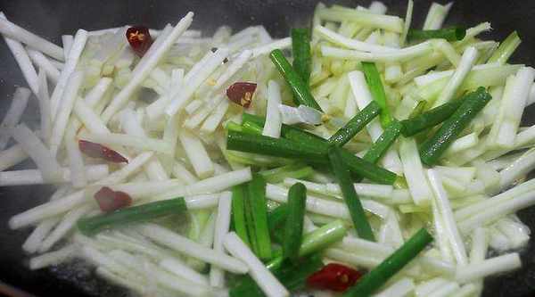 7、 鍋中加入適量的油,油熱將韭黃和配菜放入鍋中,翻炒均勻;
