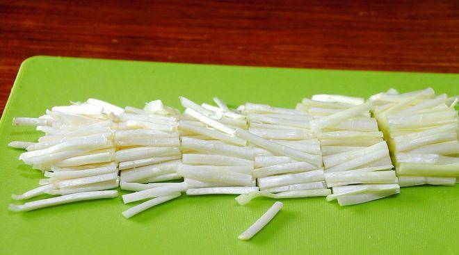 3、 大蔥先切成段落,再切成細絲,然後泡在冷水裡面,微微卷起來,會更好看;