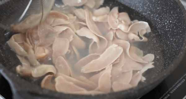 4、 鍋中加水,水開將腰片放在水裡焯一下,焯至變色後,再煮5分鐘,這樣才能熟透;