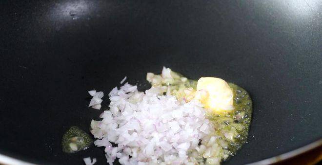 5、 往鍋裡放一塊黃油,等黃油化後放大蒜末和洋蔥末炒出香味,再加入黑胡椒粉和鹽,增加一些低味,然後再倒入一碗淡奶油,充分攪拌均勻;