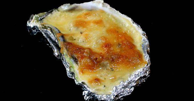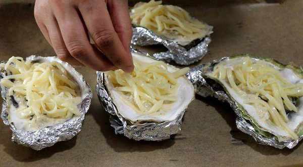 6、 將炒好的醬汁放在生蠔上面,撒上芝士碎,烤箱預熱210度烤15分鐘,即可。
