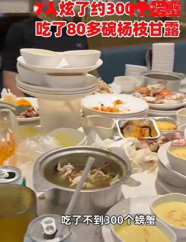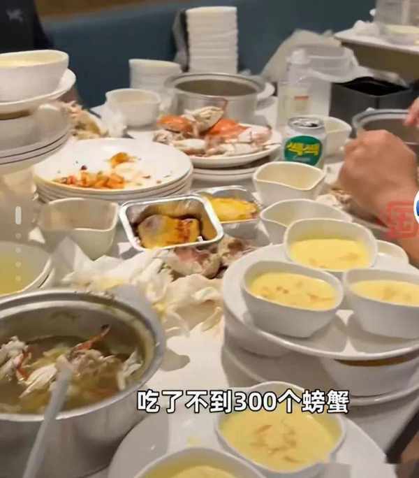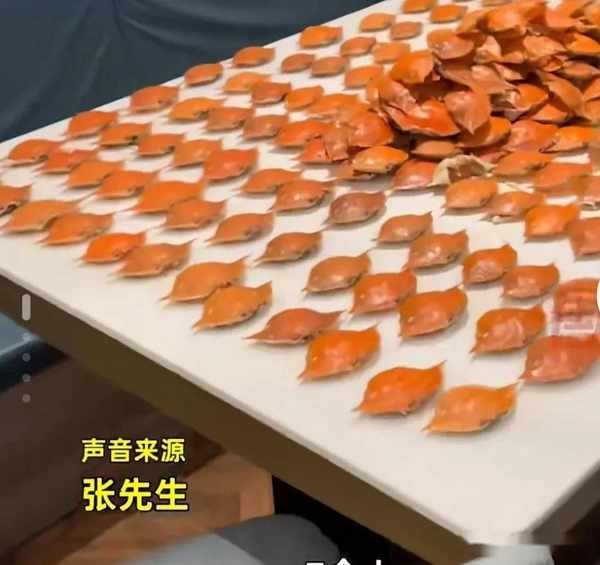 這七個人還挺有意思,吃螃蟹的時候,還把螃蟹擺放整齊滿桌子,別說老板瞭,估計服務員瞭都會很尷尬,遇到大胃王瞭。這單生意準賠瞭,300隻螃蟹的價格估計都頂的上七個人的餐費瞭,何況還有80多碗楊枝甘露和四五十盒榴蓮呢。