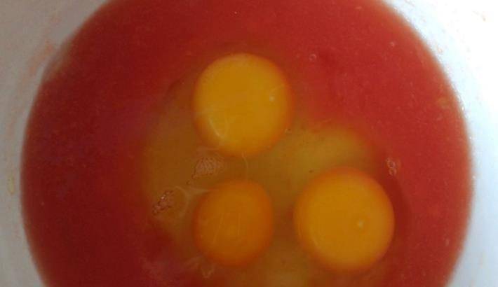 第三步:將雞蛋打入裝滿番茄汁的碗中,撒少許鹽打勻。