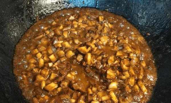 烤出香味後,將適量的幹黃醬倒入鍋中,攪拌均勻。鍋裡的豬肉、香菇等食材也會吸收幹黃醬的香味。然後倒入開水和適量的鹽,拌勻,稍煮片刻。