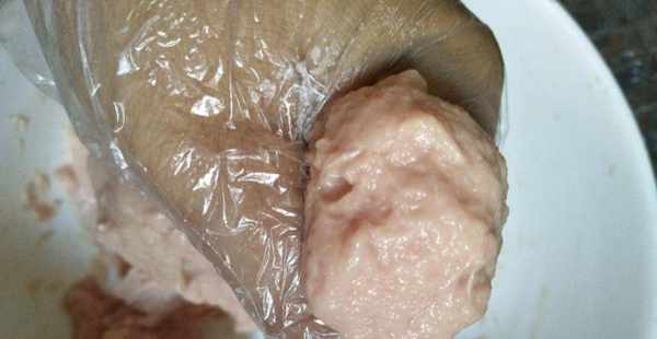 第四步,將打發好的肉糊取出放入大碗中,然後用手將肉糊打3分鐘,就完成瞭。