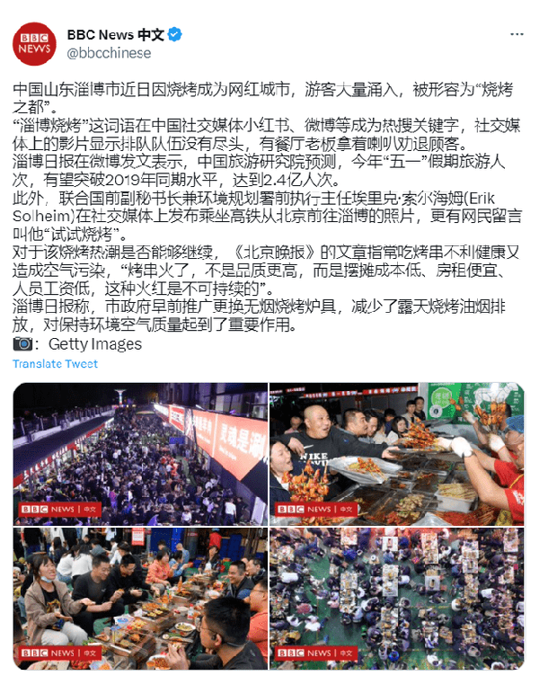 bbc發佈推文聲稱,我們國內有文章指出,這種燒烤的紅火是“不可持續”的,因為他們不利於健康又容易造成空氣污染,烤串雖然火瞭,但不是品質更高。更荒謬的是,在一些西方媒體的通稿裡,還將大量遊客湧入淄博的這種現象,稱為“發瘋式消費”。