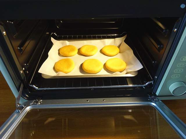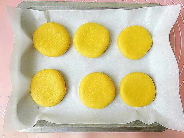 7、把做好的圓劑子搟成一厘米厚的小餅碼入烤盤。