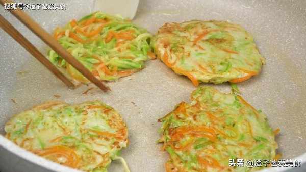 3.不粘鍋小火預熱,刷一層油,放入一團菜糊,用鏟子整理成小圓餅的形狀,攤薄一點,中火煎上一分鐘,底部凝固以後翻面,將另一面也煎一下。這個蔬菜餅特別好熟,煎至兩面金黃就可以出鍋瞭,