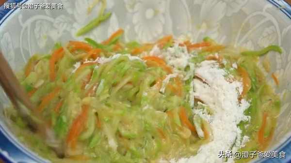 2.鍋中燒開水,加點鹽、食用油,倒入西葫蘆和胡蘿卜絲,焯燙20秒,控水撈出來倒進盆裡,用筷子抖一抖放涼,然後在裡面放入一勺蝦皮鹽,少許五香粉,淋一點食用油,將食材攪拌均勻,再打入兩個雞蛋,加入一勺面粉,攪拌到像這樣黏糊糊的狀態就可以瞭。