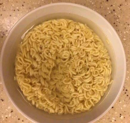 然後將面餅放入碗中,沖入開水,剛剛覆蓋面條即可,不加調料放入微波爐,中火一分鐘