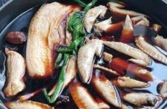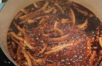 2將餘下鹵水加相同的水,三湯匙糖和薑煮滾後,將鴨舌和醮料一同放入煲內,約十分鐘後再加老抽可慢慢加,加到自己喜歡的顏色。約十五分鐘鴨舌巳熟透。