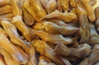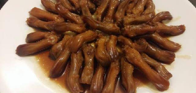 1鴨舌先用熱水飛一飛水,飛水後加三湯匙鹵水和兩湯匙糖醮一陣。