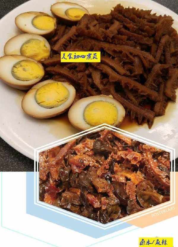4把牛肚一開二,將鹵水料煮滾後牛肚和巳去殼的雞蛋放入,明火先煮15分鐘,之後放入蒸爐80度蒸兩小時。如用明火小火先炆1小時,煲凍瞭再炆1小時。