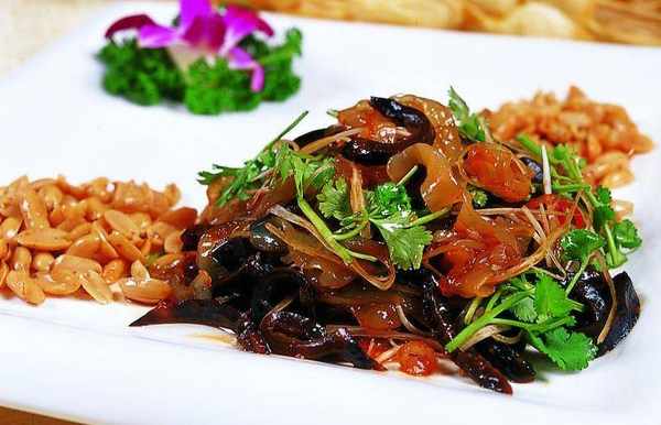 青芥辣撈起遼參蜇頭,活海參煮軟爛、片大片,活鮑魚洗清潔,片大片焯熟,牛百葉、蜇頭片大片,木耳撕片,香菜切段,大蔥切末,紅尖椒切小片,泡椒切段。雞湯去油過濾,加全部調味料、泡椒段入冷躲箱。牛百葉、蜇頭、木耳焯水洗沐,與海參、鮑魚片放入冰水。將主、配料放入冰涼雞湯即可。