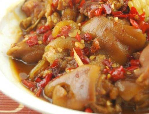 乳香剁椒豬蹄:把煮好的豬蹄,瀝幹水備用,調汁,把腐乳、香油混合,放一點點豬手湯攪勻後,對上足量的清水,約可以沒過豬手一半的樣子,充分攪拌,鍋中倒入少許炒菜油,放入一塊冰糖小火融化,待冰糖溶化後,倒入煮好的豬蹄,不斷翻炒上色,見微微上色後,烹入老抽,放入2大勺剁椒,快速翻炒幾下後,淋上腐乳汁,約沒豬蹄一半左右的位置,喜歡的話可以加上玉米,翻炒,大火收汁即可裝盤,又香又辣。